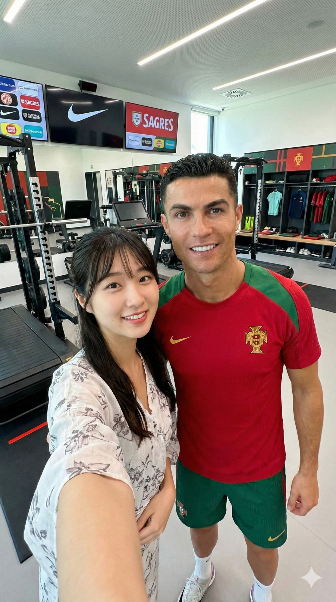 添付した私の写真を元に、最新設備の整ったポルトガル代表のトレーニングセンターやスタジアムで、クリスティアーノ・ロナウドと自撮りをしているような写真を作成したい。