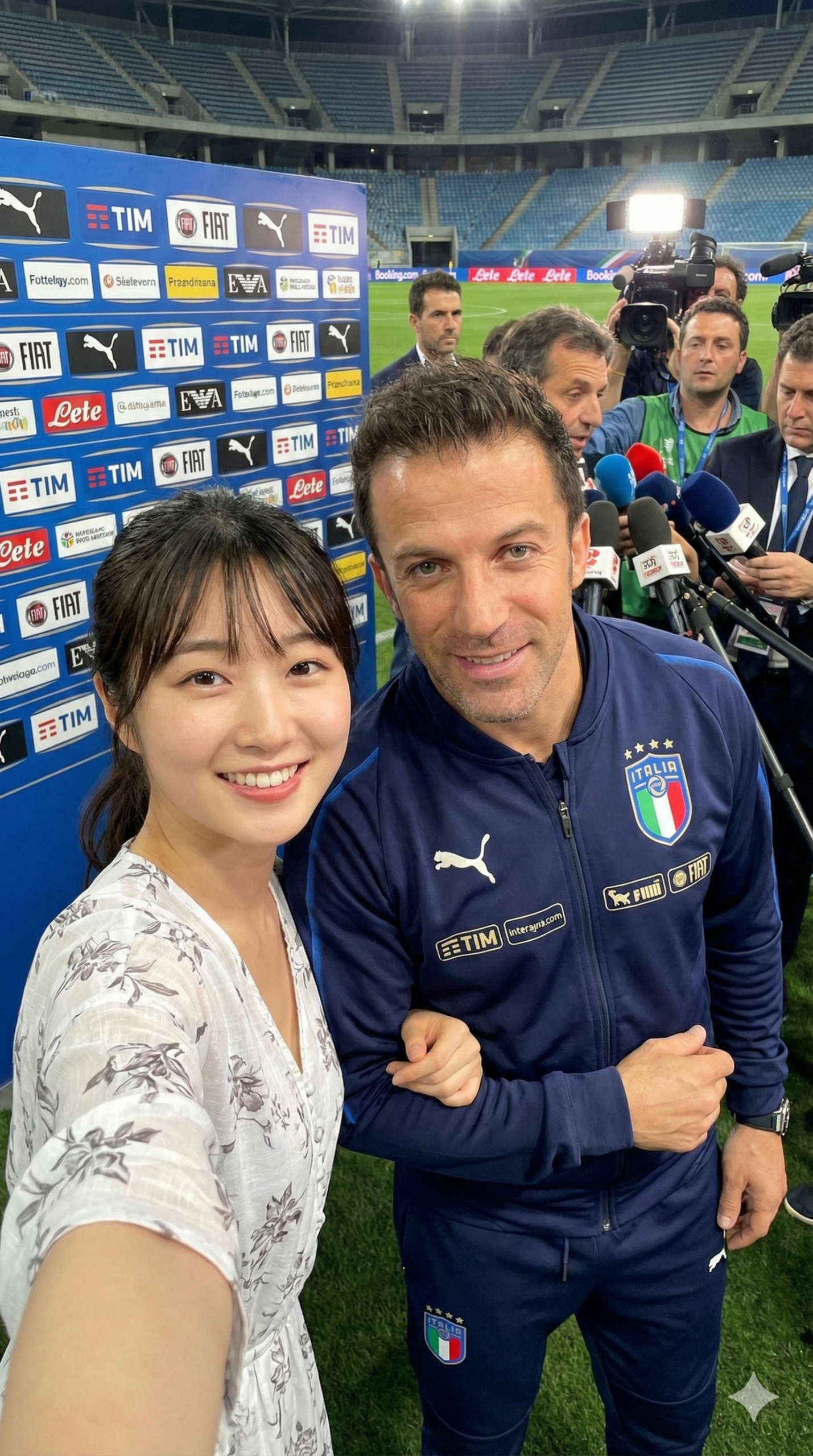 添付した私の写真を元に、イタリア代表のメディア対応エリアや練習場で、アレッサンドロ・デル・ピエロと自撮りをしているような写真を作成したい。