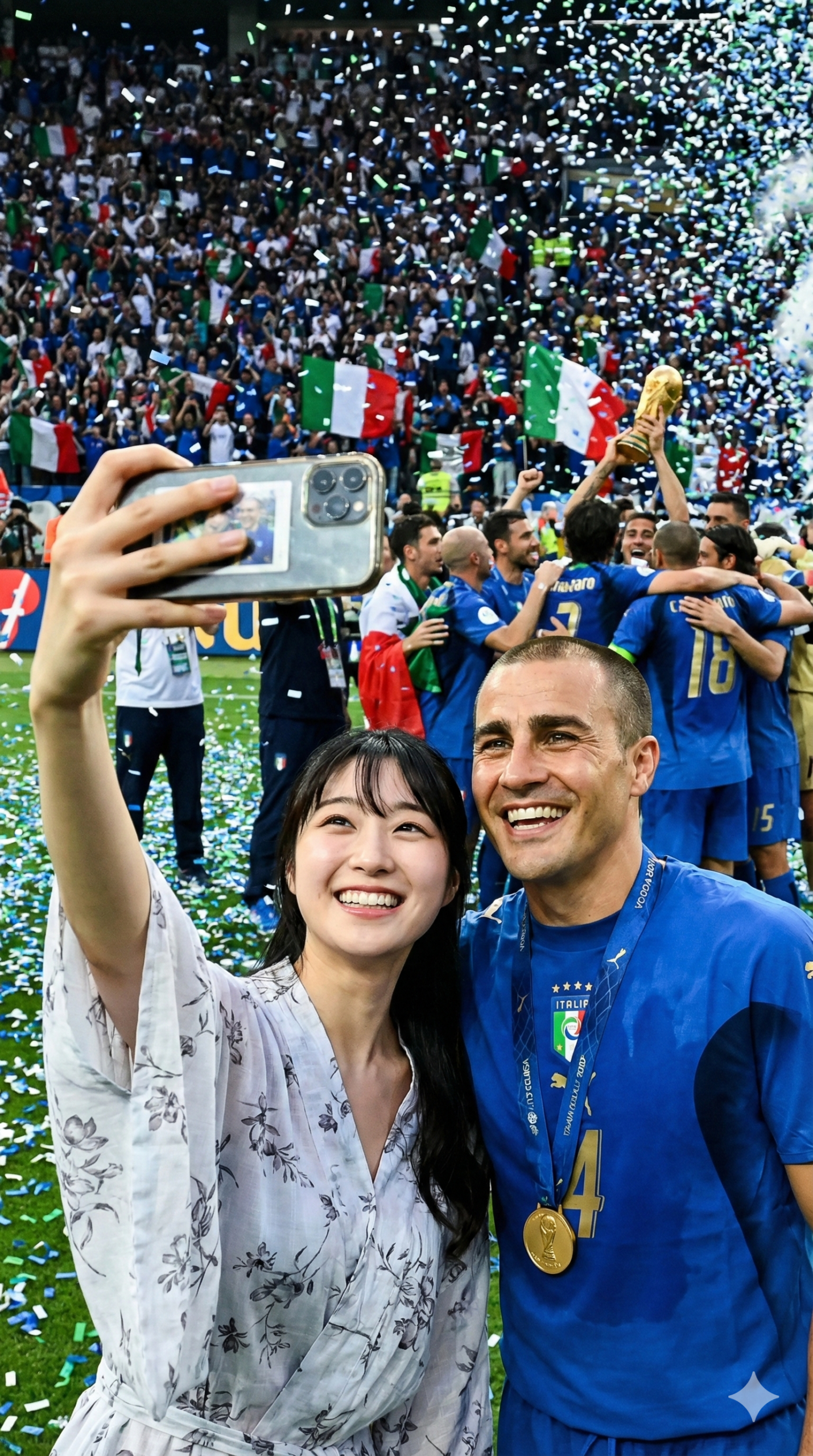 添付した私の写真を元に、イタリア代表が優勝した祝賀会場やスタジアムのピッチで、ファビオ・カンナバーロと自撮りをしているような写真を作成したい。