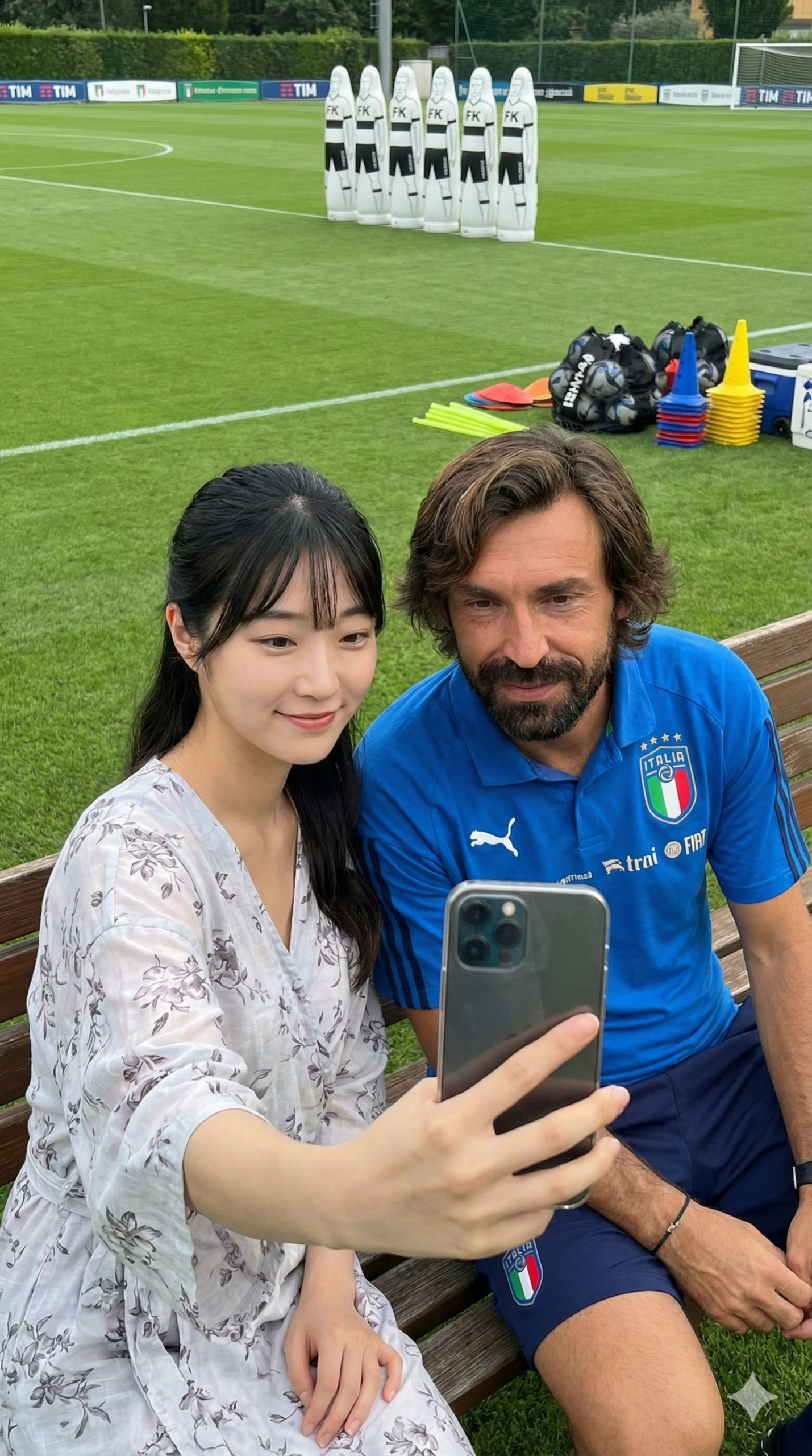 添付した私の写真を元に、イタリア代表の静かな練習場のベンチやリラックスエリアで、アンドレア・ピルロと自撮りをしているような写真を作成したい。