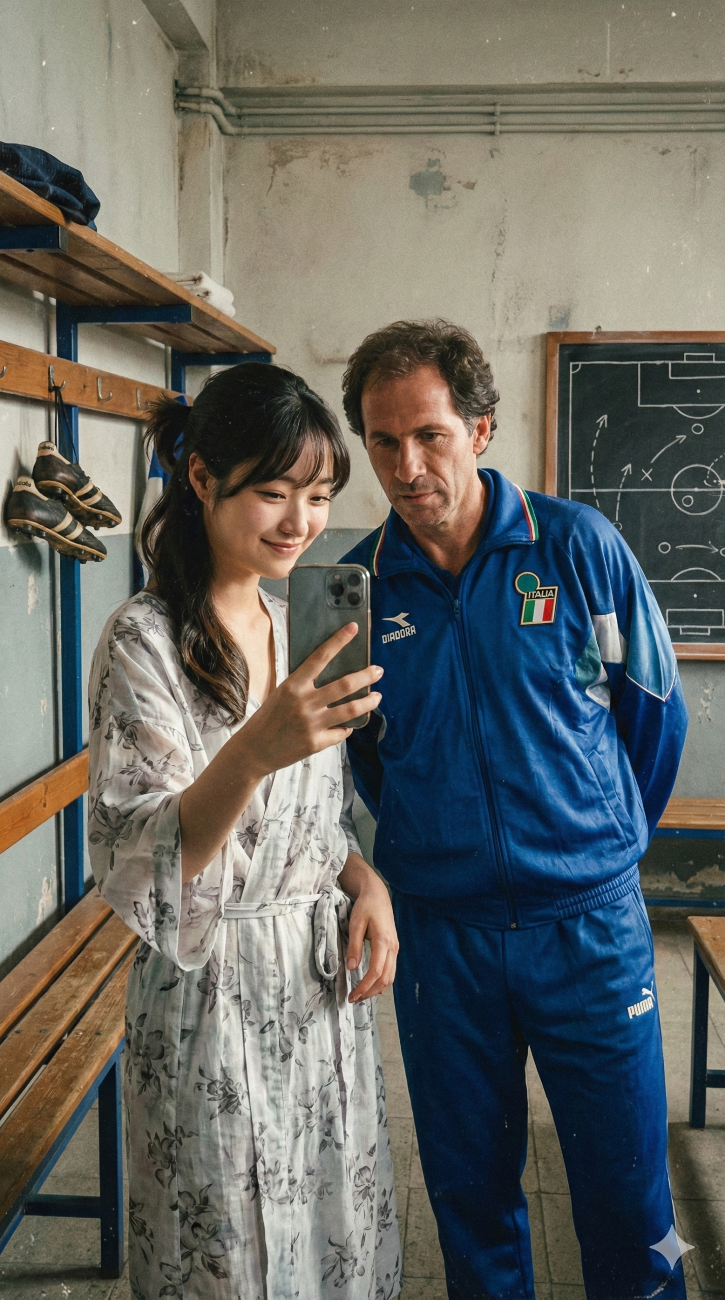 添付した私の写真を元に、80年代後半から90年代初頭のイタリア代表の練習場やロッカールームで、フランコ・バレージと自撮りをしているような写真を作成したい。