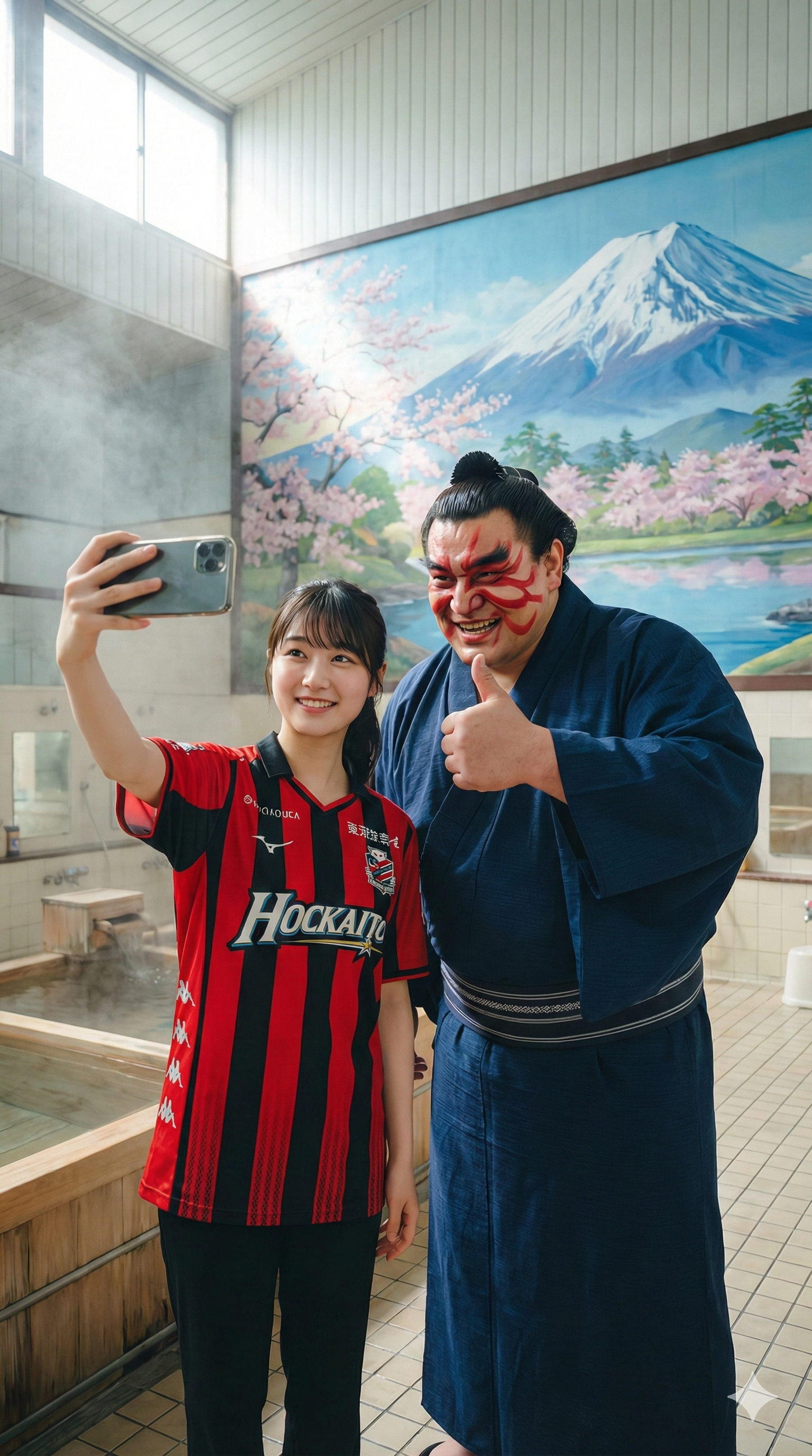 Vertical 9:16 video, third-person perspective. A young woman wearing a Hokkaido Consadole Sapporo jersey (Red and Black vertical stripes) takes a selfie with E. Honda. Honda, with his kabuki face paint and yukata (or sumo mawashi), strikes a kabuki pose or gives a thumbs-up to her phone. The camera captures them from the side. Background is a Japanese bathhouse with a Mount Fuji mural. Colorful and realistic, 8k.
