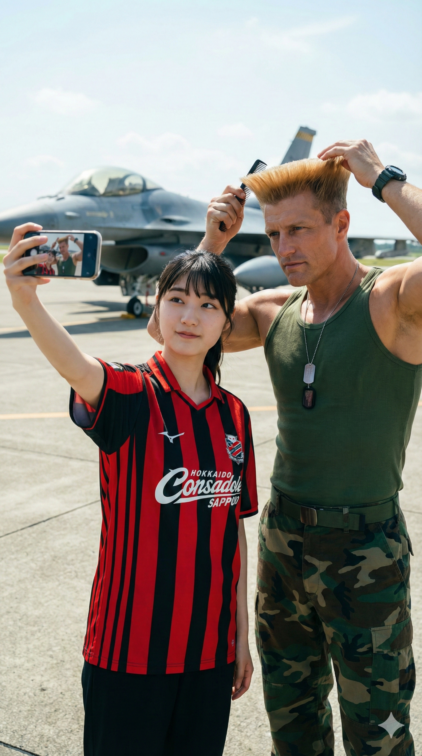 Vertical 9:16 video, third-person perspective. A young woman in a Hokkaido Consadole Sapporo jersey (Red and Black vertical stripes) extends her arm for a selfie with Guile. Guile, in his green tank top and camouflage pants, combs his iconic flat-top hair with one hand while looking coolly at her phone. The shot is from a bystander's view. Background is an air force base with a fighter jet parked behind them. Cinematic, 8k.