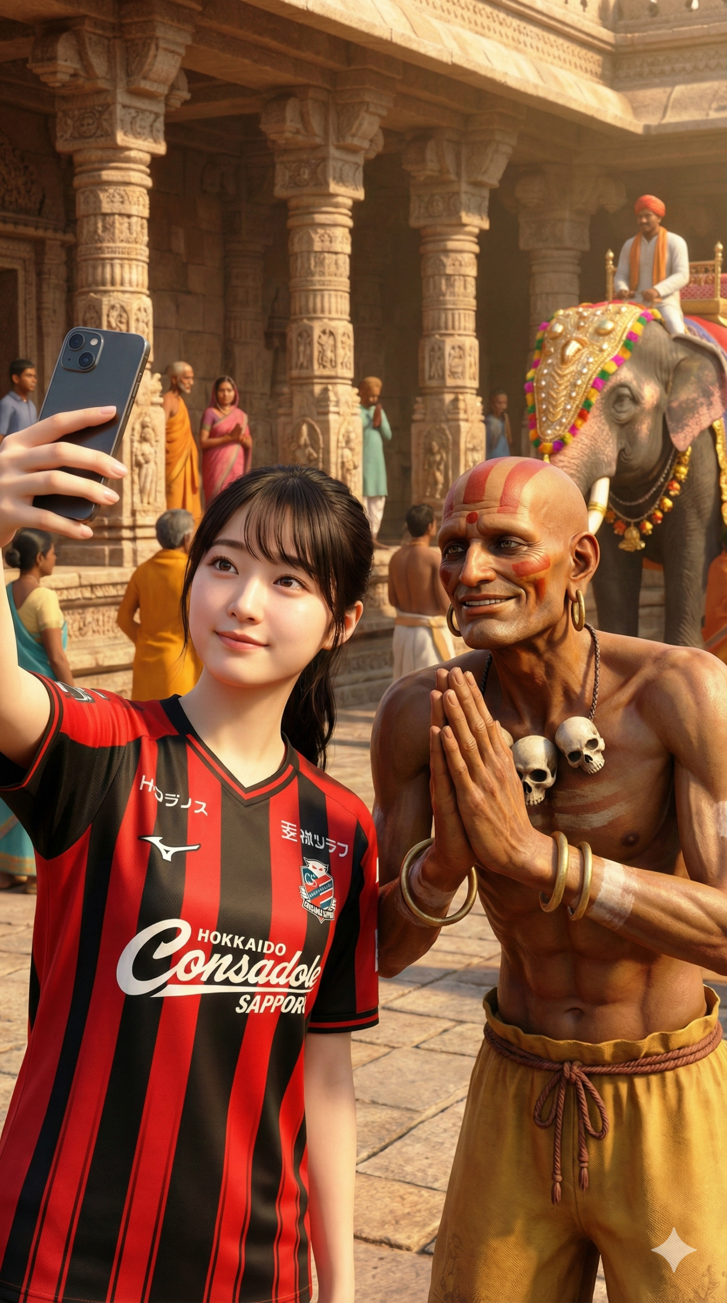 Vertical 9:16 video, third-person perspective. A young woman in a Hokkaido Consadole Sapporo jersey (Red and Black vertical stripes) holds a phone for a selfie with Dhalsim. Dhalsim, thin and painted, puts his hands together in a prayer pose and smiles peacefully at the camera. The shot is a medium view. Background is an Indian temple with elephants. Realistic, 8k.