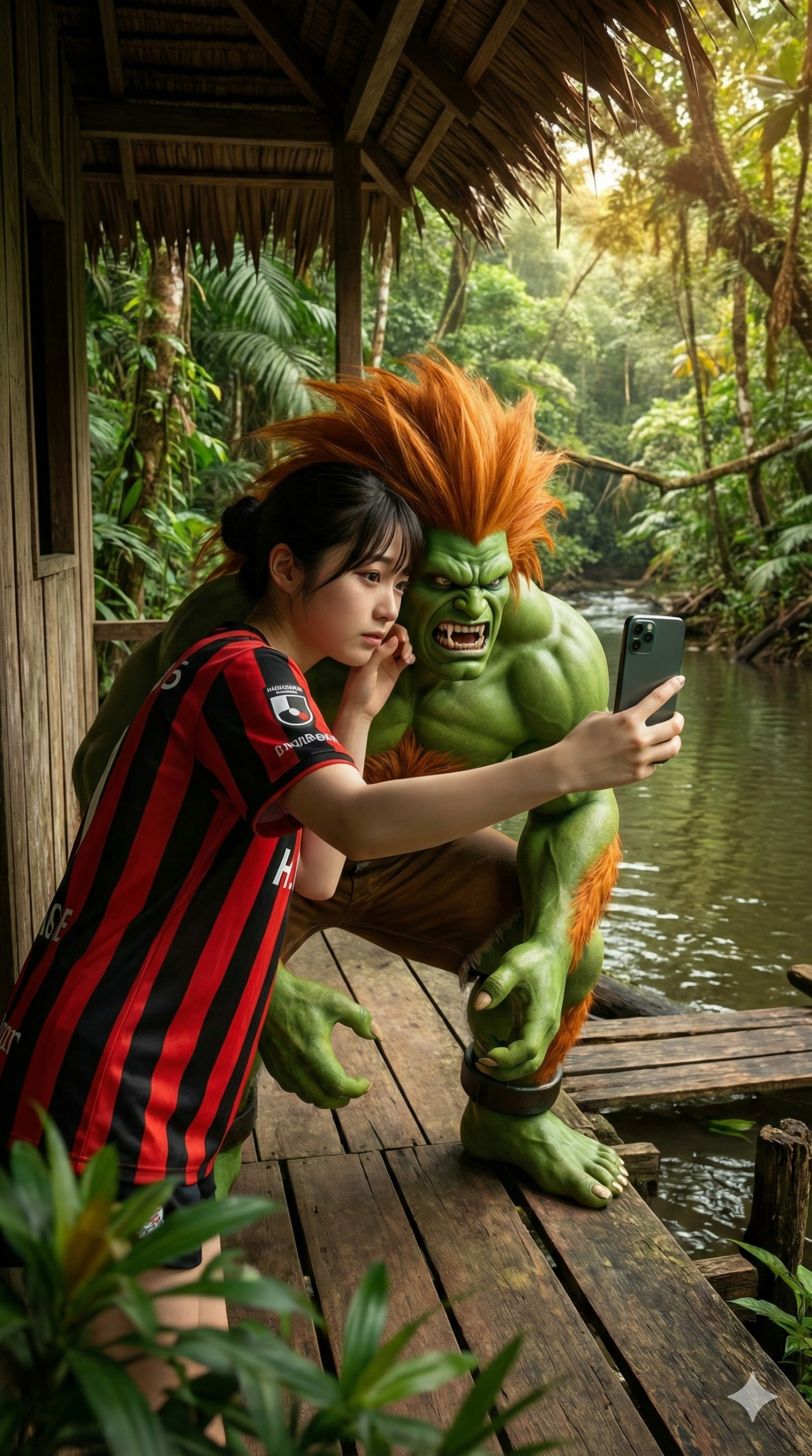 Vertical 9:16 video, third-person perspective. A young woman in a Hokkaido Consadole Sapporo jersey (Red and Black vertical stripes) leans in cautiously to take a selfie with Blanka. Blanka, green-skinned with orange hair, growls playfully or smiles showing his fangs at the smartphone. The shot is from a side angle. Background is a dense Amazon jungle hut on a river. Texture rich, 8k.