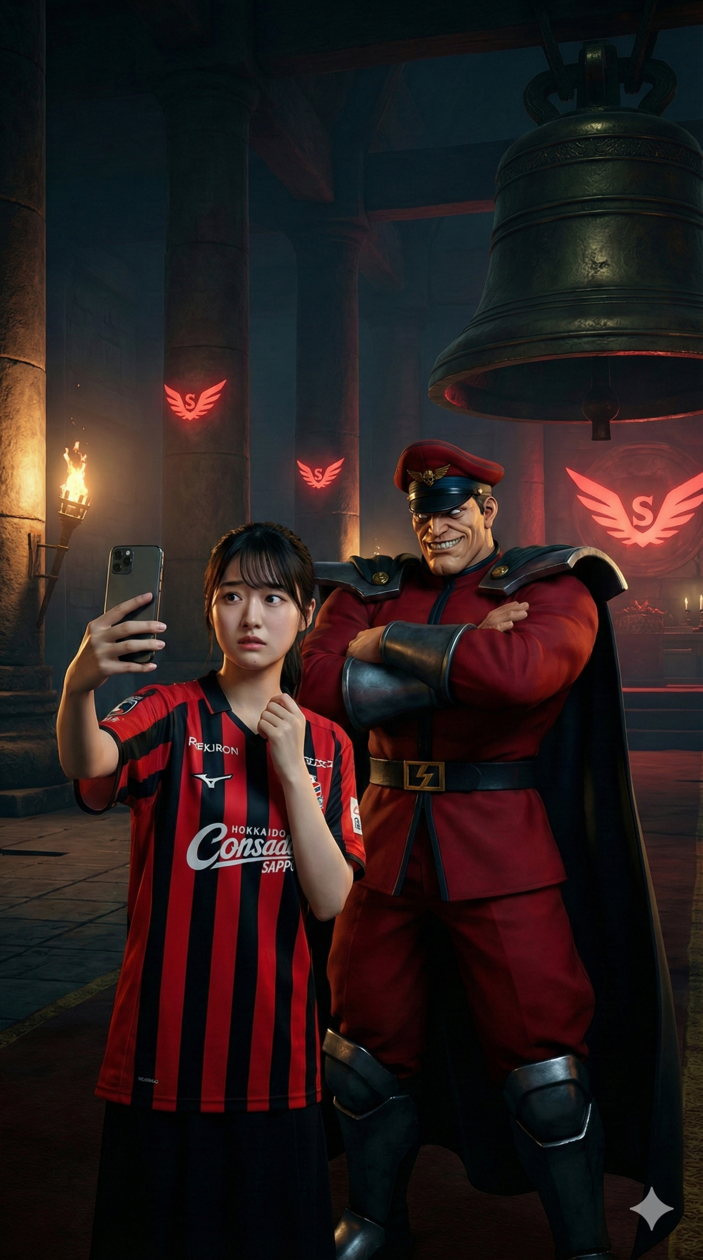 Vertical 9:16 video, third-person perspective. A young woman wearing a Hokkaido Consadole Sapporo jersey (Red and Black vertical stripes) nervously holds up a phone for a selfie with M. Bison (Vega in Japan). Bison, in his red military uniform and peaked cap, stands with arms crossed, smirking evilly at the camera lens. The perspective is from a third person. Background is a dark Shadaloo base temple with a bell. Cinematic lighting, 8k.