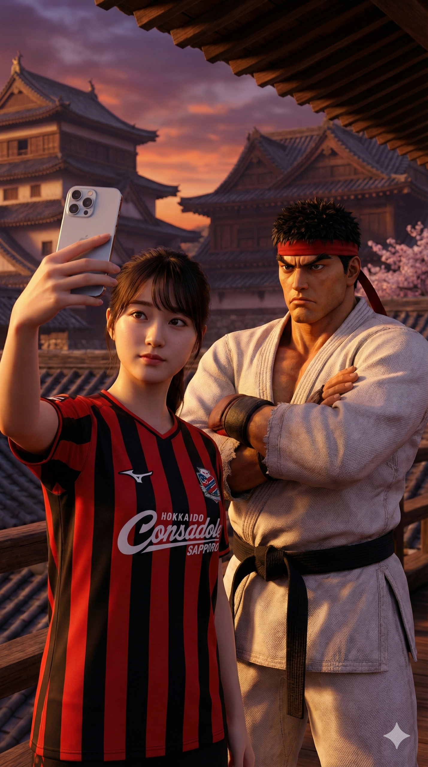 Vertical 9:16 video, third-person perspective. A young woman in a Hokkaido Consadole Sapporo jersey (Red and Black vertical stripes) holds up a smartphone to take a selfie with Ryu (Street Fighter). Ryu, wearing his white karate gi and red headband, crosses his arms and looks at the camera with a serious but calm expression. The shot is a medium side view. Background is the Suzaku Castle rooftops at sunset. Realistic texture, 8k.