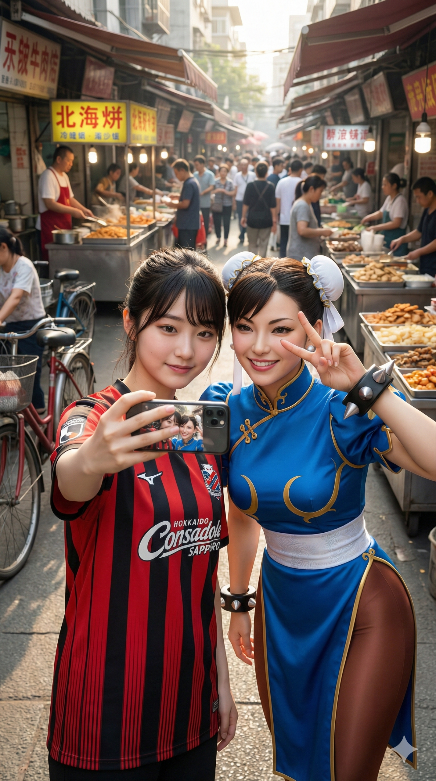 Vertical 9:16 video, third-person perspective. A young woman wearing a Hokkaido Consadole Sapporo jersey (Red and Black vertical stripes) leans in to take a selfie with Chun-Li. Chun-Li, in her blue qipao and spiked bracelets, flashes a cute "V" sign and smiles brightly at the smartphone. The camera captures them from the side. Background is a bustling Chinese street market with bicycles and food stalls. Detailed and realistic, 8k.